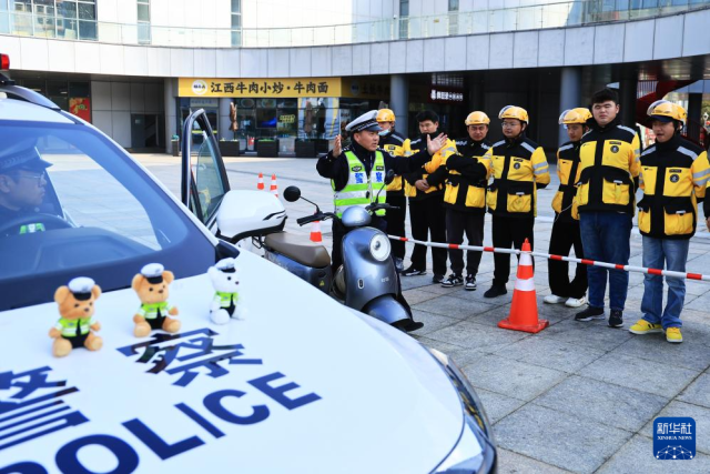 12月2日,在浙江省舟山市临城街道,舟山市交警在为外卖配送员讲解“开门杀”的成因和注意事项。新华社发(邢守秒摄)