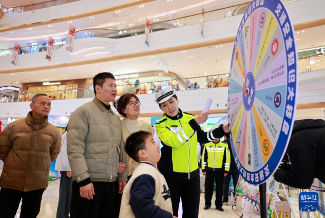 12月1日,在江苏泰兴吾悦广场内,交警与市民共同参与交通安全知识大转盘趣味互动。新华社发(顾继红摄)