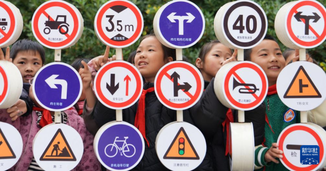 12月2日,学生在江苏省海安市墩头镇中心小学“交通安全标识翻转墙”前认识交通安全标识。新华社发(周强摄)