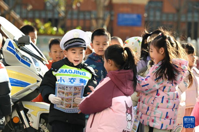 12月2日,在河北省石家庄市新华区柏林幼儿园,一名“小交警”给小朋友发放交通安全宣传页。新华社发(陈其保摄)