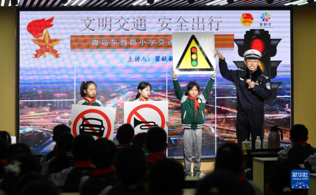 12月2日,在山东省青岛市市北区东胜路小学,交警指导学生学习交通标志。新华社发(王海滨摄)