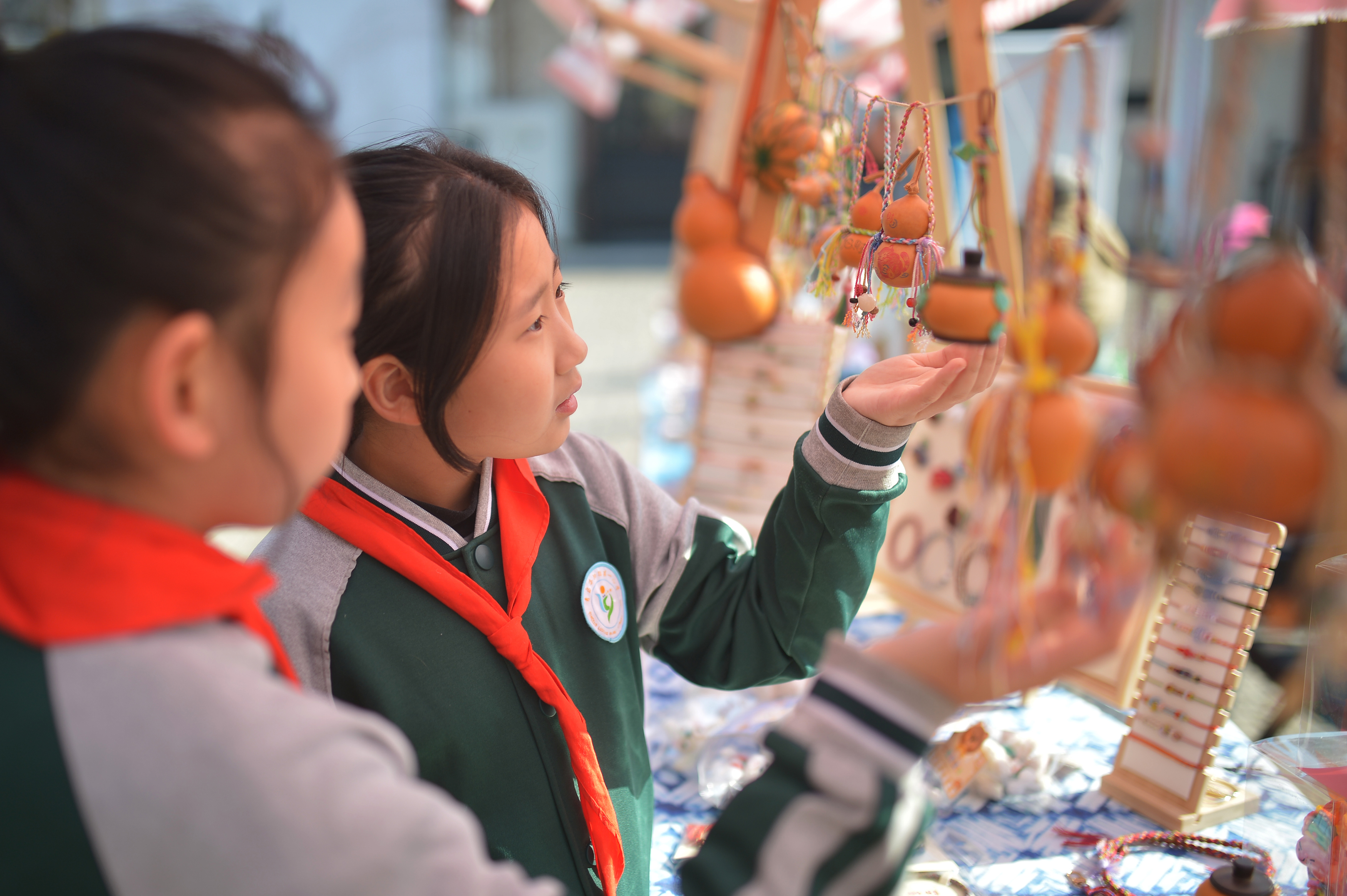 在山东省青岛市市北区洛阳路第一小学开展的研学活动上,学生们在非遗手造市集上观赏手工葫芦。通讯员 王海滨 摄