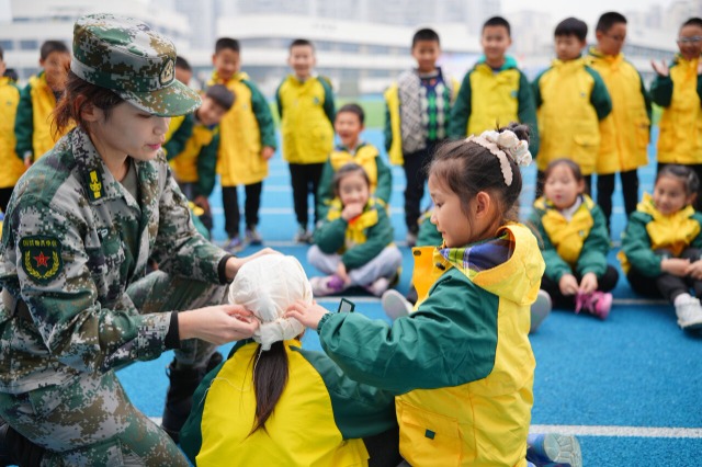 2025年12月9日,西南大学国防教育示范团队砺剑班、女子国旗班的队员们走进西南大学附属小学,举行“国防启童蒙,共筑强军梦”国防教育开放日活动。学生们有序分组,参与定向越野、战术体验、战场救护等实践体验,现场以“大手牵小手”的方式协同开展,为学生们带来了一堂生动的国防教育课,以提升青少年的国防意识和爱国情怀。(中国教育报-中国教育新闻网 通讯员 秦廷富 摄)