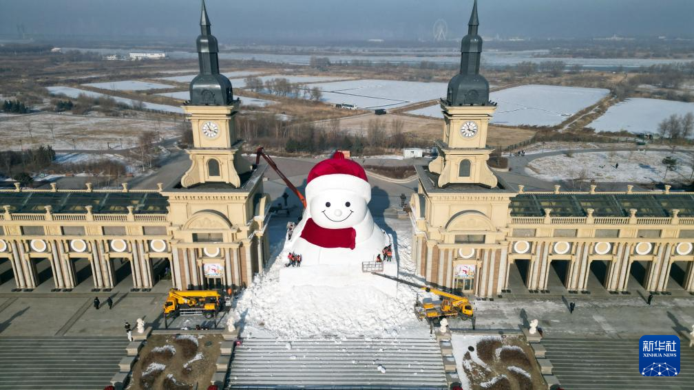 12月14日拍摄的建设中的哈尔滨市群力音乐公园网红大雪人(无人机照片)。