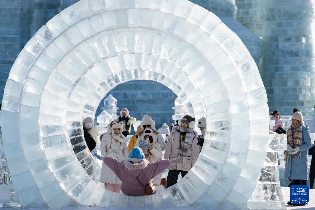 1月2日,人们在哈尔滨冰雪大世界园区拍照。