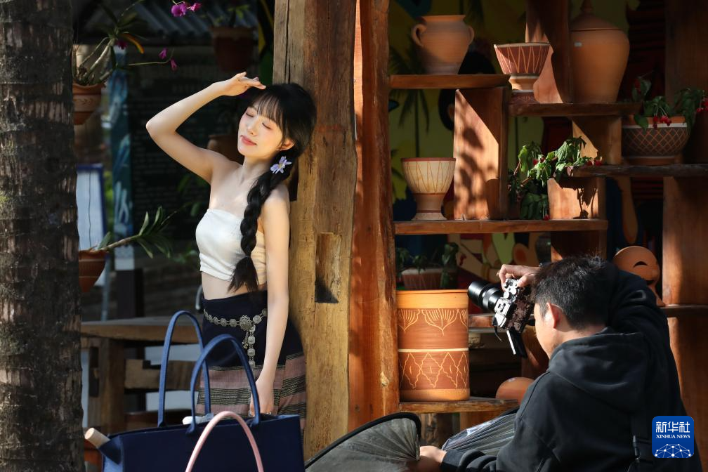1月2日,游客在云南省景洪市曼弄枫街道曼贺纳古寨拍照。