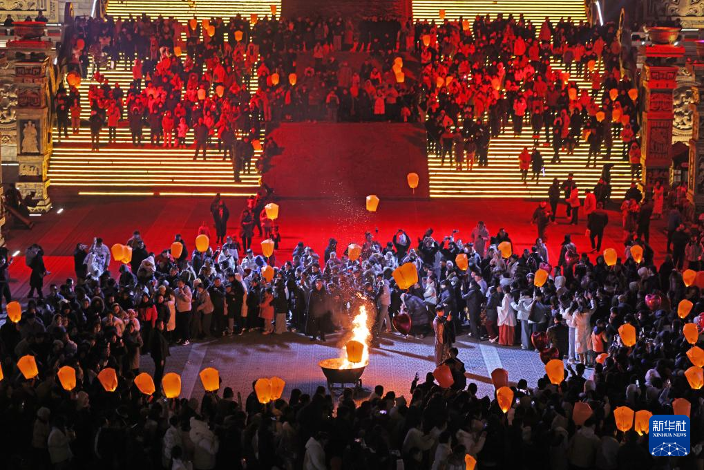 1月1日,游客在山东乐陵影视城景区观看表演(无人机照片)。