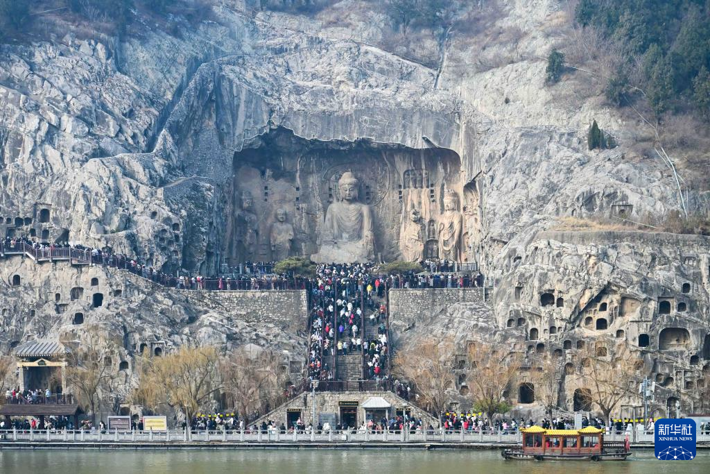 1月2日,游客在河南洛阳龙门石窟景区游览。