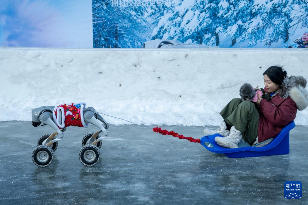 1月5日,游客在哈尔滨冰雪嘉年华园区乘坐机器人拉爬犁。