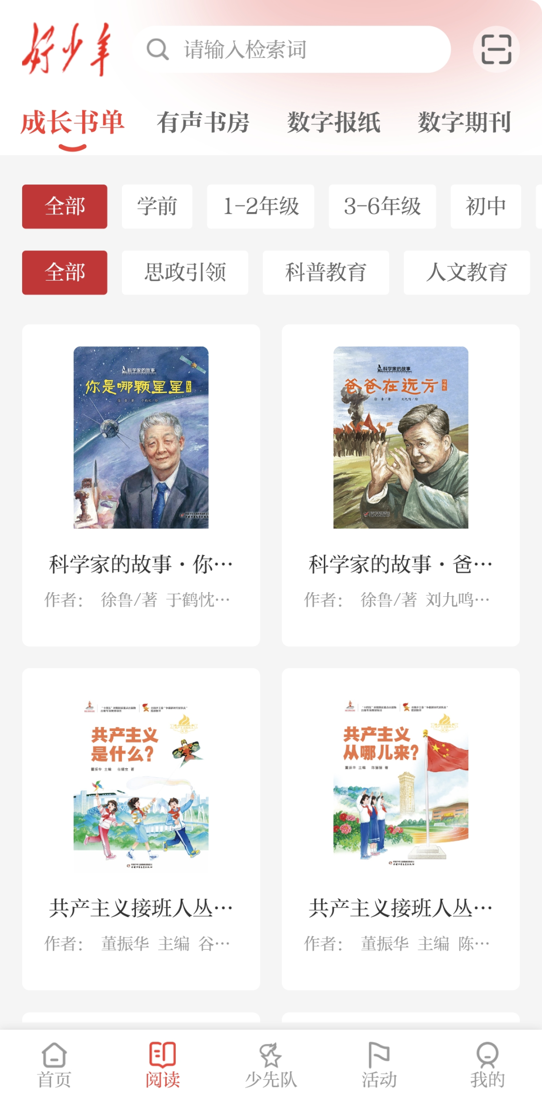 阅读服务是“好少年”APP的核心特色板块。精选中少总社数字报刊、重点图书及有声读物等优质资源,用户可便捷阅读《中国少年报》《我们爱科学》《儿童文学》等数字报刊;成长书单按年级与主题对精品数字图书分类,打造家长引导孩子开展阶梯性阅读的专属空间,提供优质资源与专业指导。有声书房板块汇集《林汉达历史故事》《猫武士》等超高人气IP内容,涵盖古诗文诵读、儿童文学、科普百科等系列有声书,总时长达上万分钟,助力少年儿童通过听觉输入积累知识、提升综合素养。