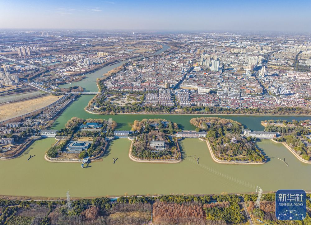 ↑1月11日拍摄的位于江苏省扬州市江都区的南水北调东线源头江都水利枢纽(无人机照片)。新华社发(任飞摄)