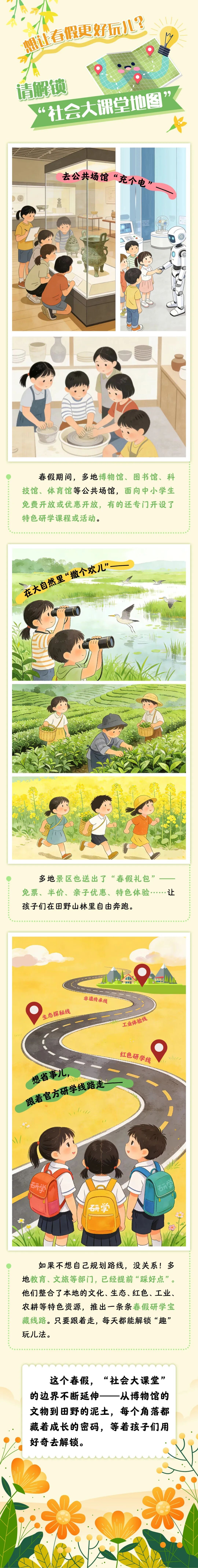 答案就在下面两份“春假宝藏地图”里——从家门口的守护,到天地间的课堂,社会多方力量携手护航,让这个春天,成为孩子们童年里一段美好的回忆。