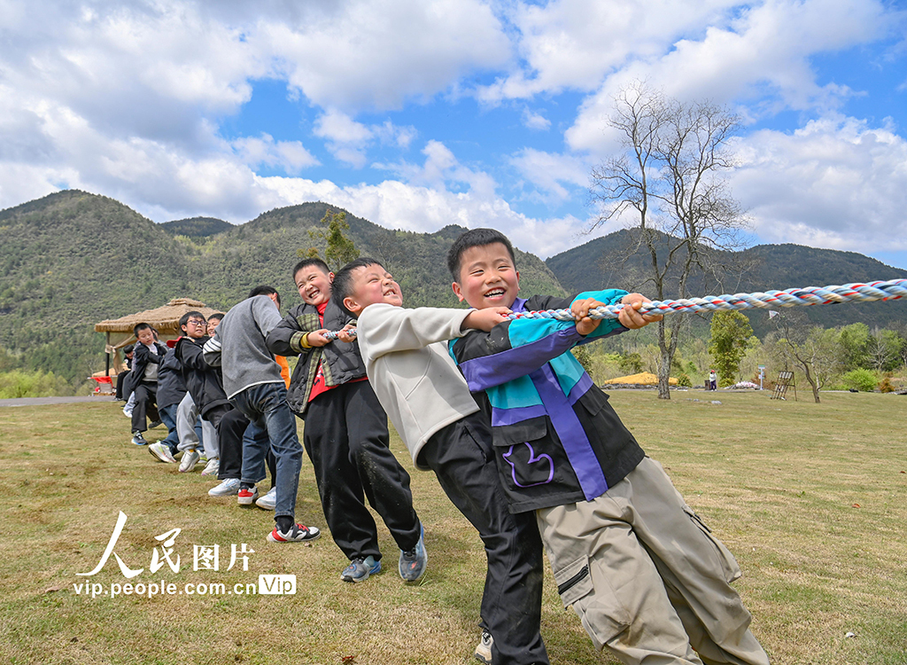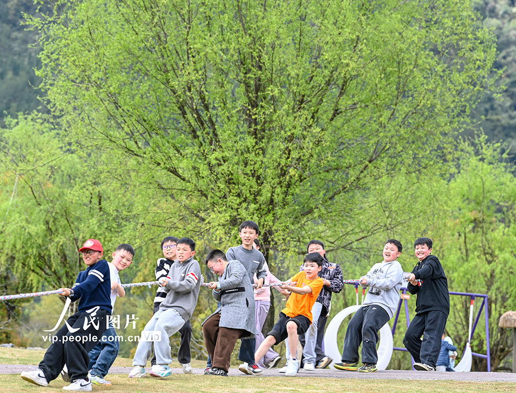 2026年4月3日,孩子们在重庆酉阳土家族苗族自治县叠石花谷景区参加趣味拔河活动,乐享春假时光。冉川摄(人民图片网)