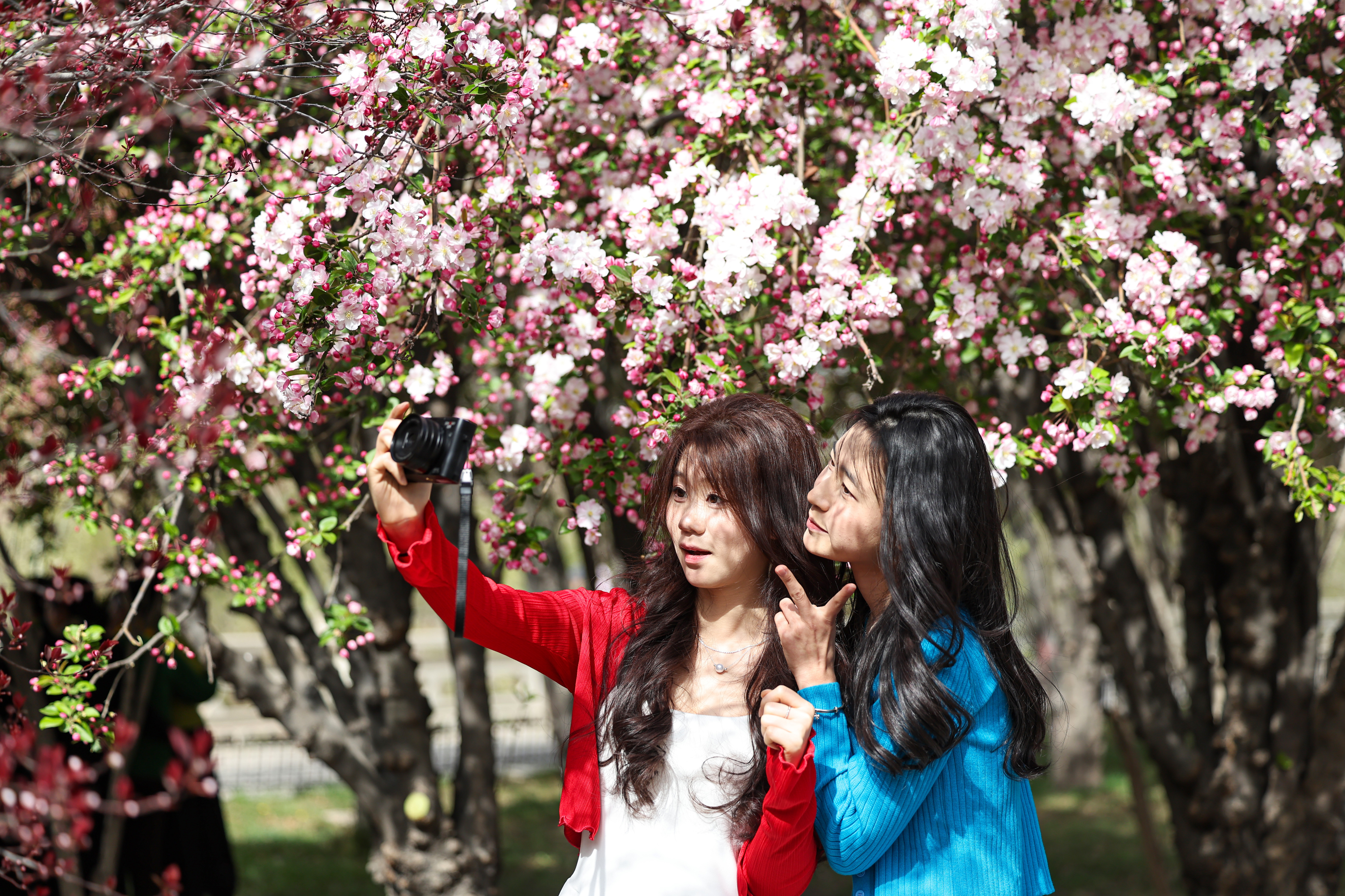 4月5日,在甘肃省兰州市城关区北滨河路,来自西北民族大学的两名学生在赏花留影。学校供图