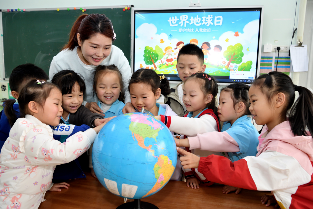 教师借助地球仪向孩子们讲解地球知识。通讯员 杨韬 焦王璇 摄