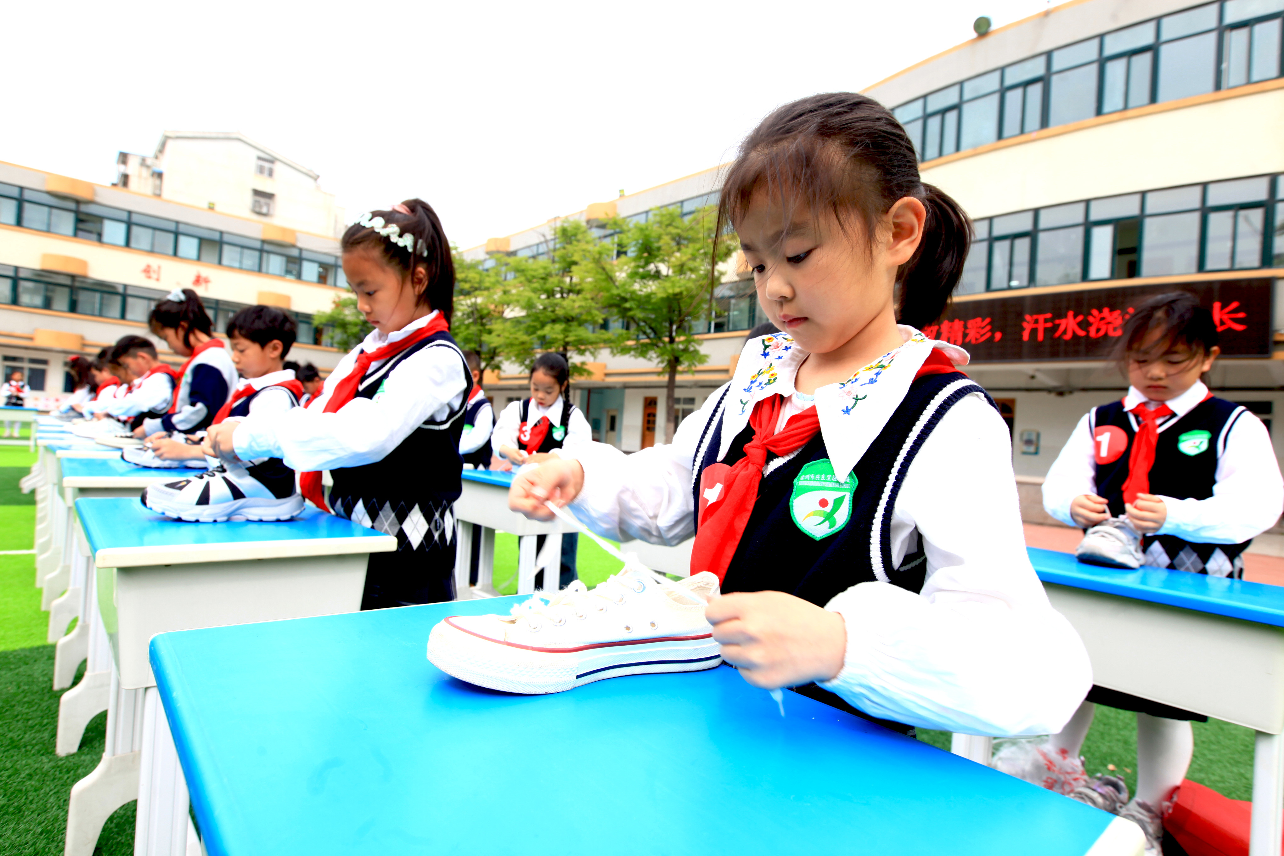 江苏省徐州市兴东实验学校,小学生在比赛系鞋带。