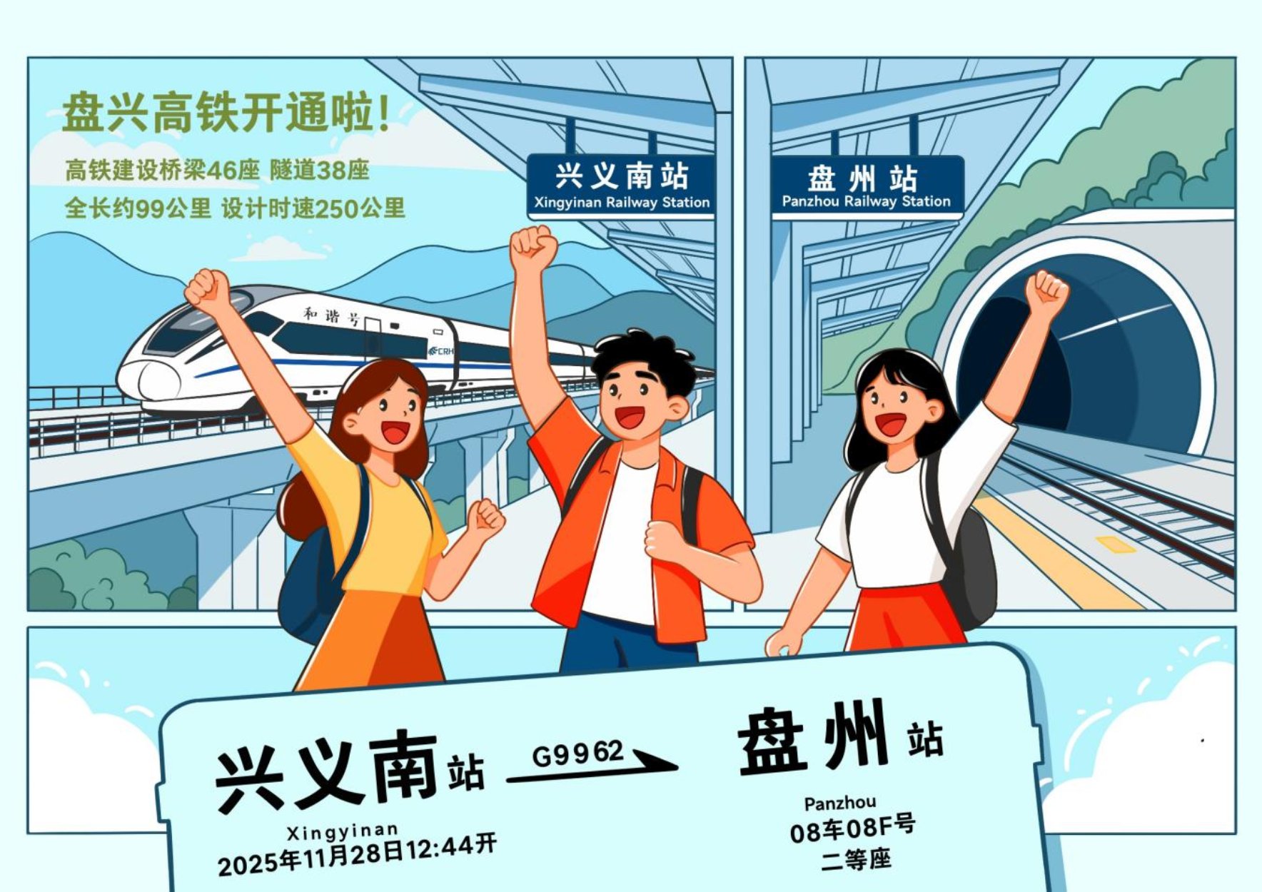 未来,期待盘兴高铁持续释放“高铁红利”,稳稳托起人们对美好生活的新期待,为推动区域协调发展书写更加精彩的篇章,为加快建设交通强国注入源源不断的力量。(文字:吴语萱、简艳;漫画:李廉绪)