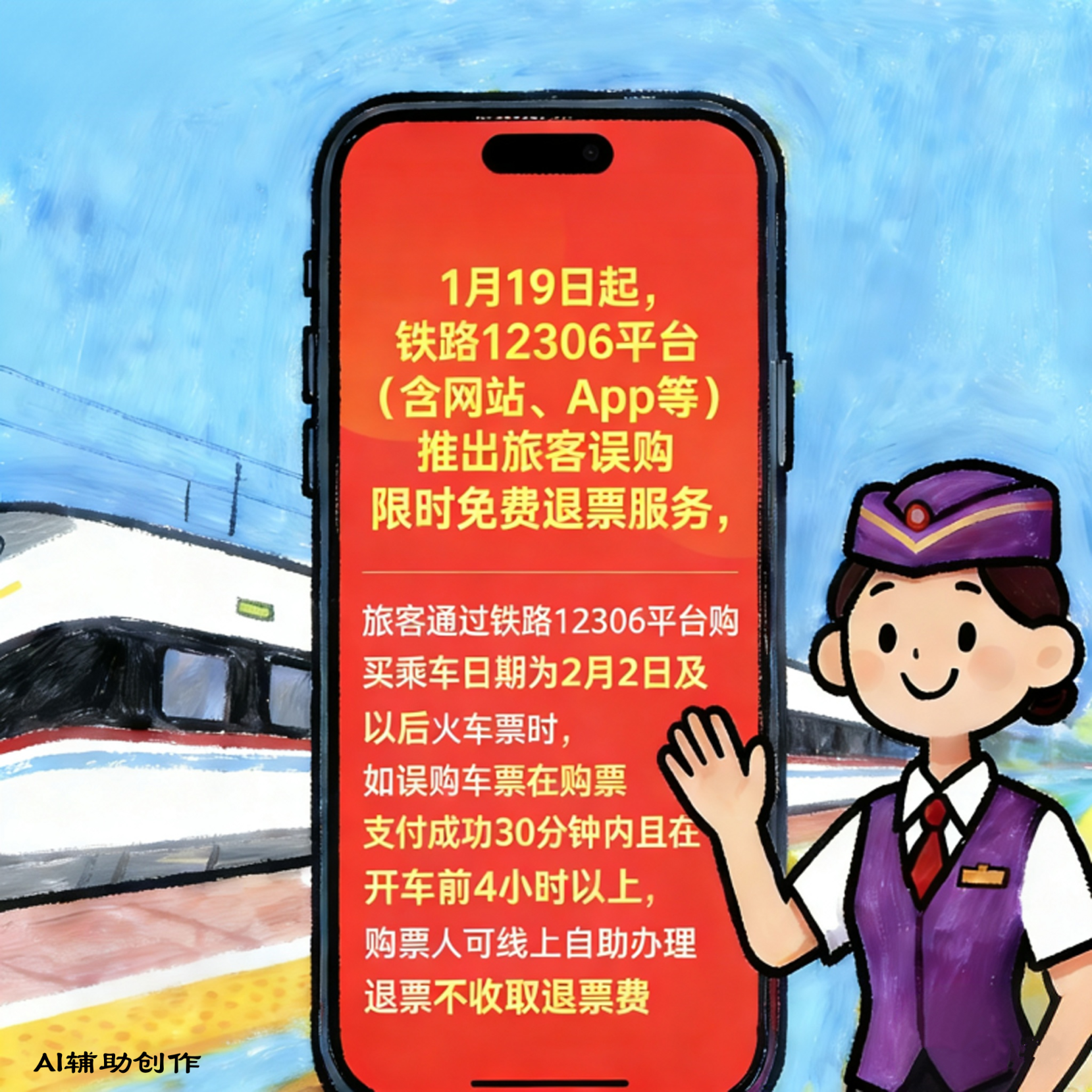 1月19日起,铁路12306平台(含网站、客户端)推出旅客误购限时免费退票服务。这一举措为广大旅客提供了更加便捷和人性化的购票体验——旅客在购买2月2日及以后的火车票时,若出现了误购情况,在购票支付成功后的30分钟内且在列车开车前4小时以上,购票人可线上自助办理退票,全程无需支付任何退票费用。