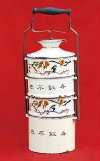 这个饭盒分为三层,每一层都用隶书体刻写着同样的四个字:“每饭不忘”。