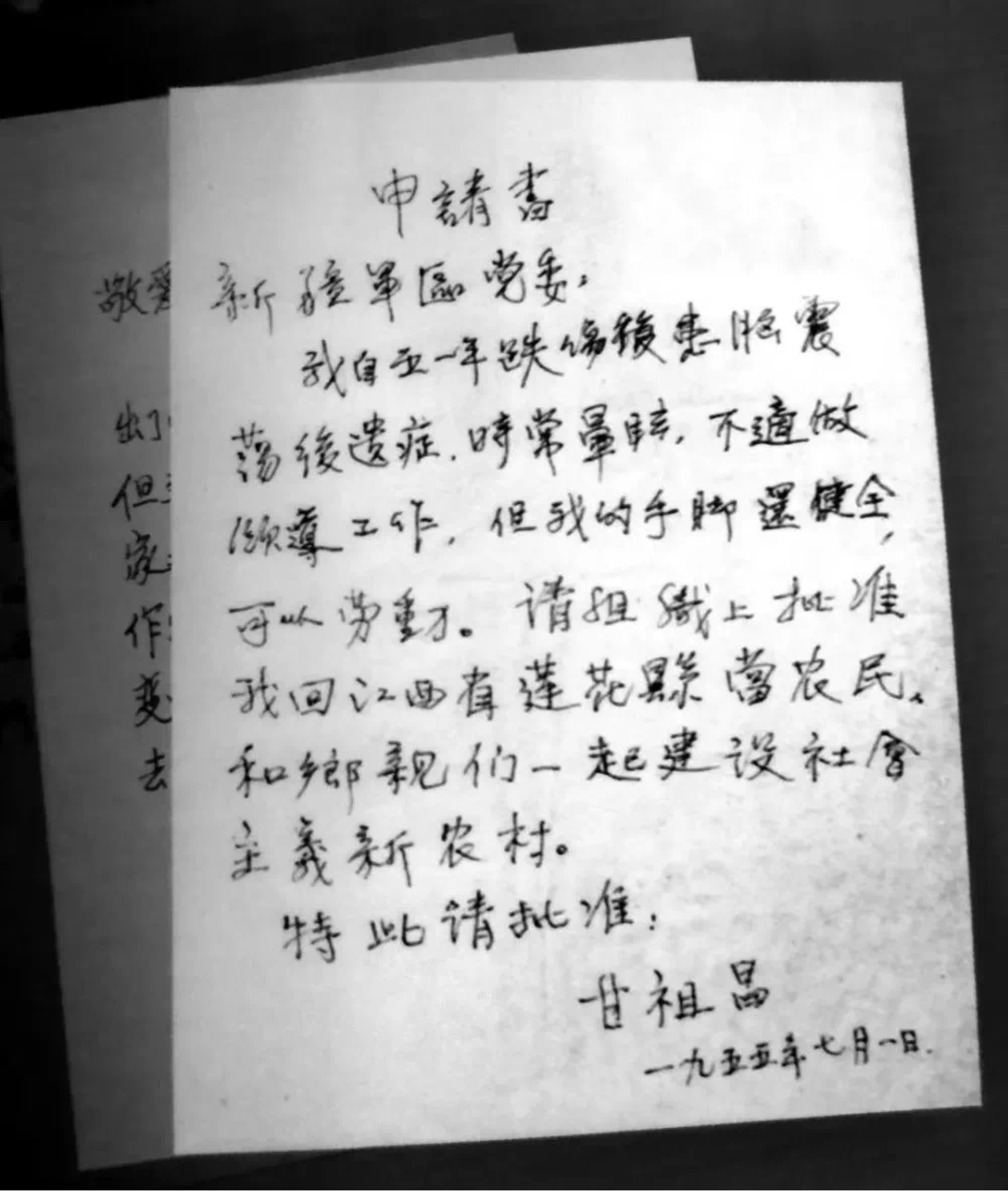 (图为甘祖昌将军手写申请书,连续三年向组织递交申请要求请辞、回老家当农民)