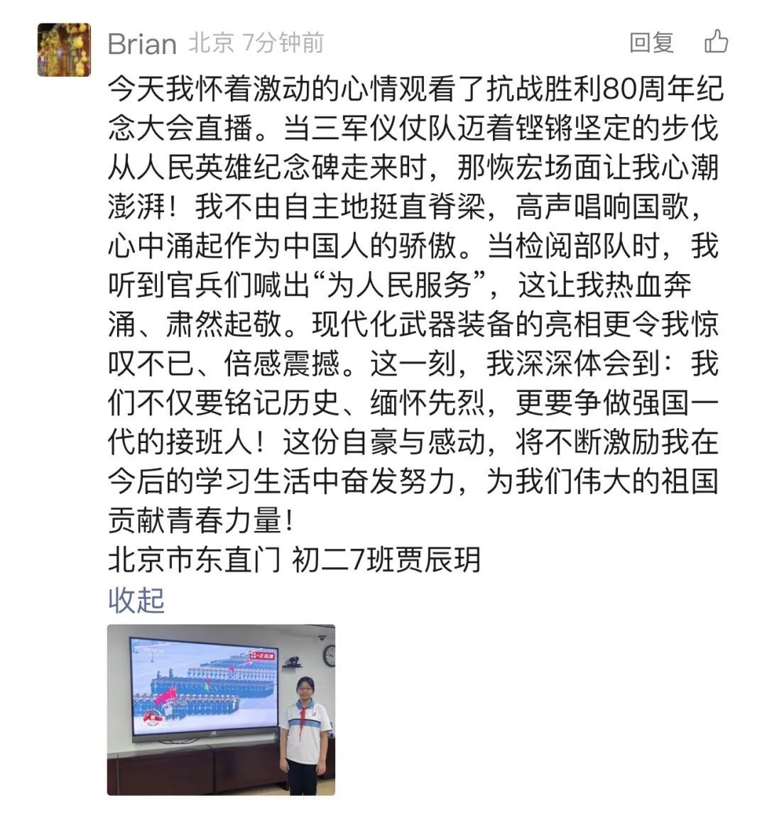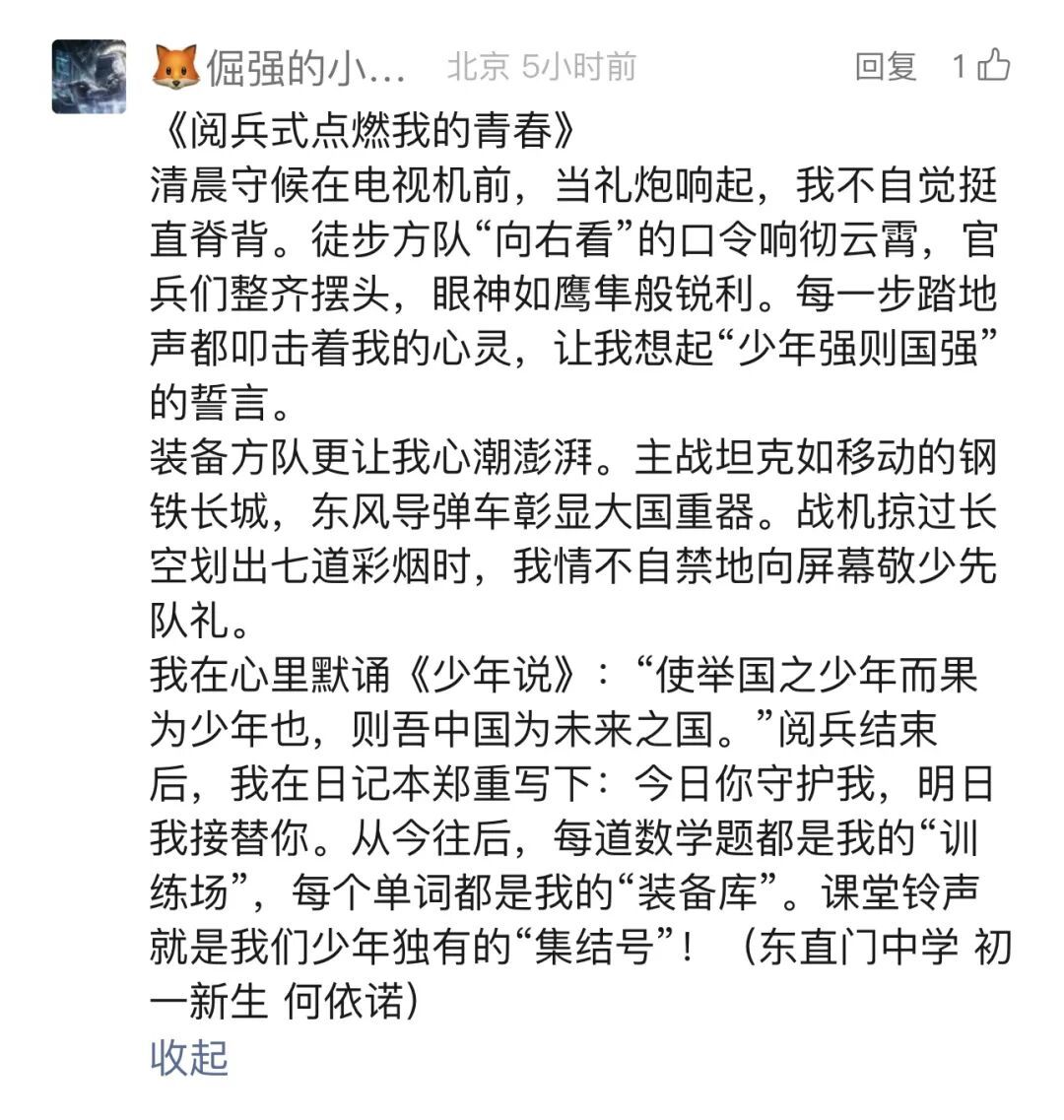 北京市东直门中学初一学生 何依诺:“阅兵结束后,我在日记本郑重写下:今日你守护我,明日我接替你。从今往后,每道数学题都是我的“训练场”,每个单词都是我的“装备库”。课堂铃声就是我们少年独有的“集结号”!”