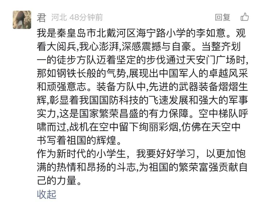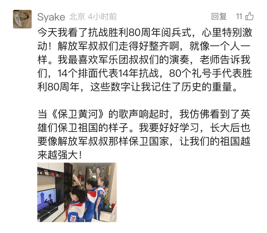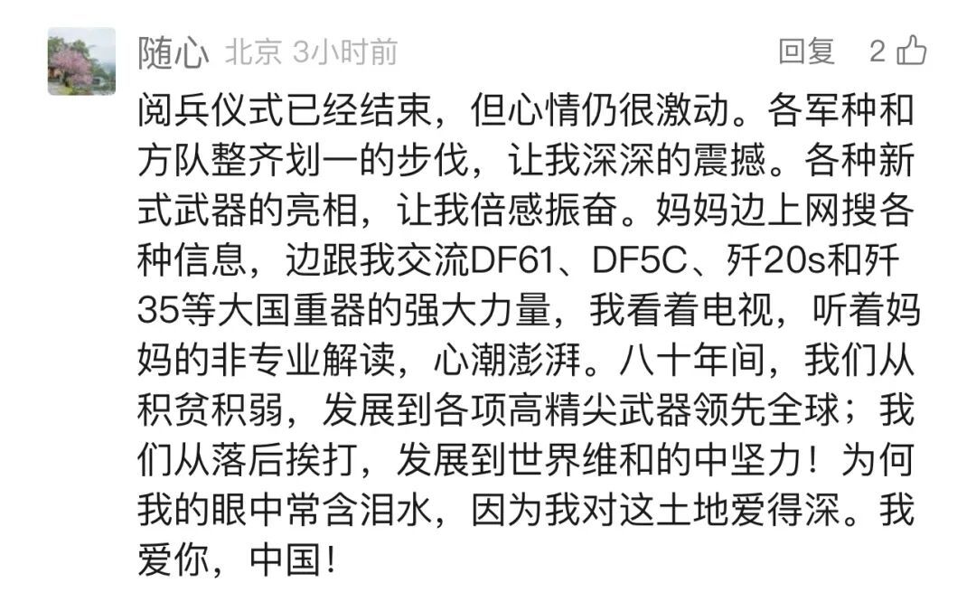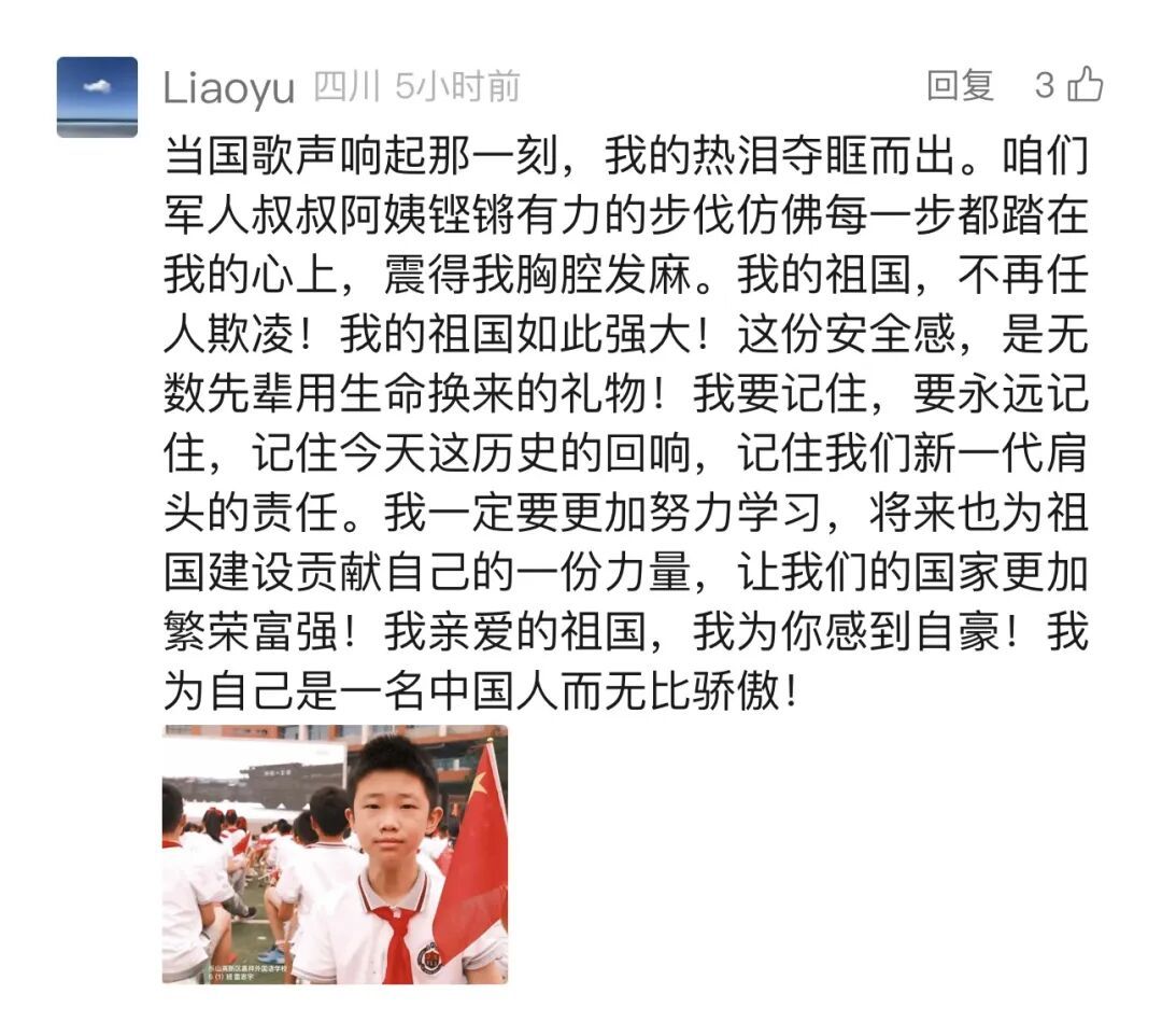 四川的网友“Liaoyu”:“当国歌声响起那一刻,我的热泪夺眶而出。咱们军人叔叔阿姨铿锵有力的步伐,仿佛每一步都踏在我的心上,震得我胸腔发麻。我要记住,要永远记住,记住今天这历史的回响,记住我们新一代肩头的责任。”