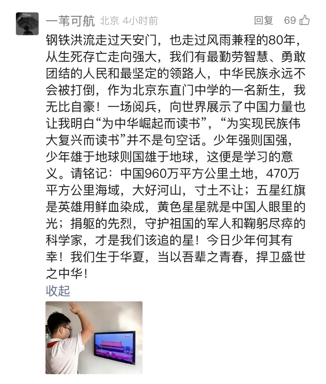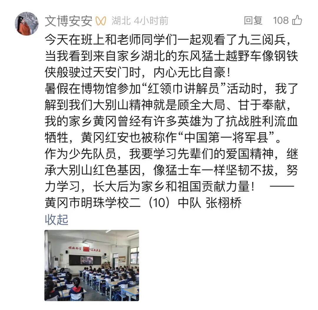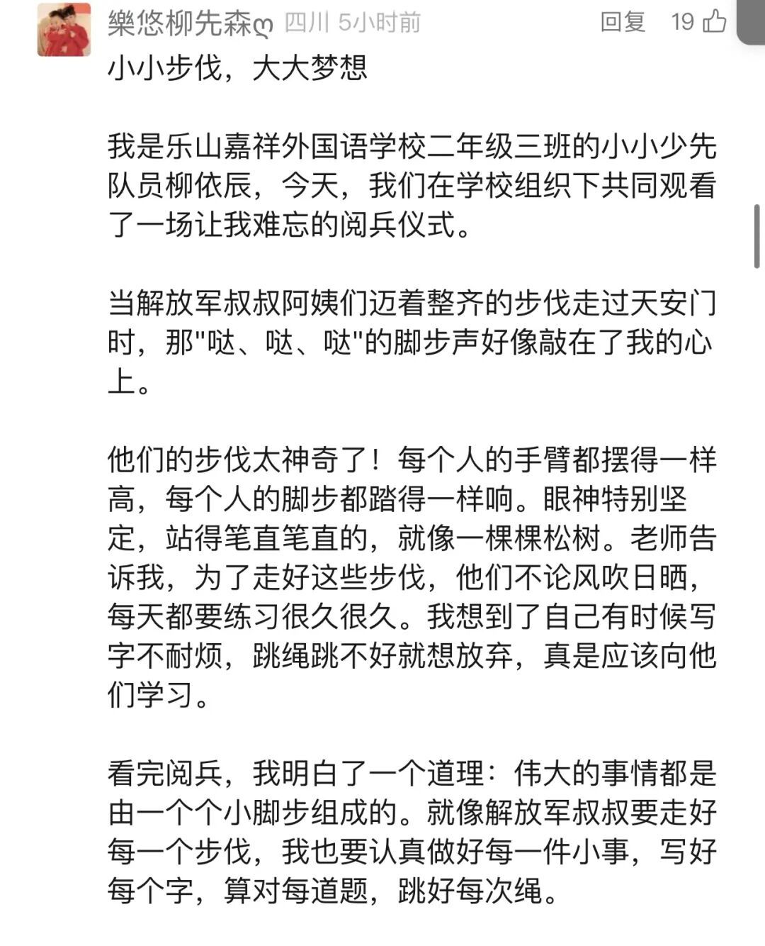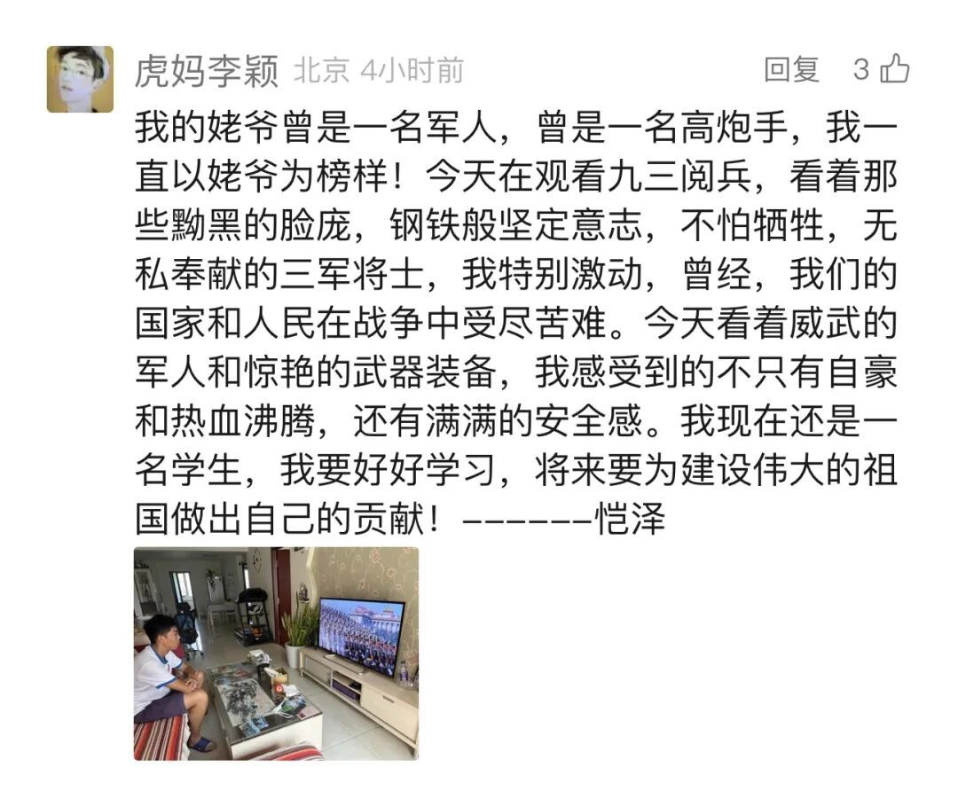 四川的网友“Liaoyu”:“当国歌声响起那一刻,我的热泪夺眶而出。咱们军人叔叔阿姨铿锵有力的步伐,仿佛每一步都踏在我的心上,震得我胸腔发麻。我要记住,要永远记住,记住今天这历史的回响,记住我们新一代肩头的责任。”