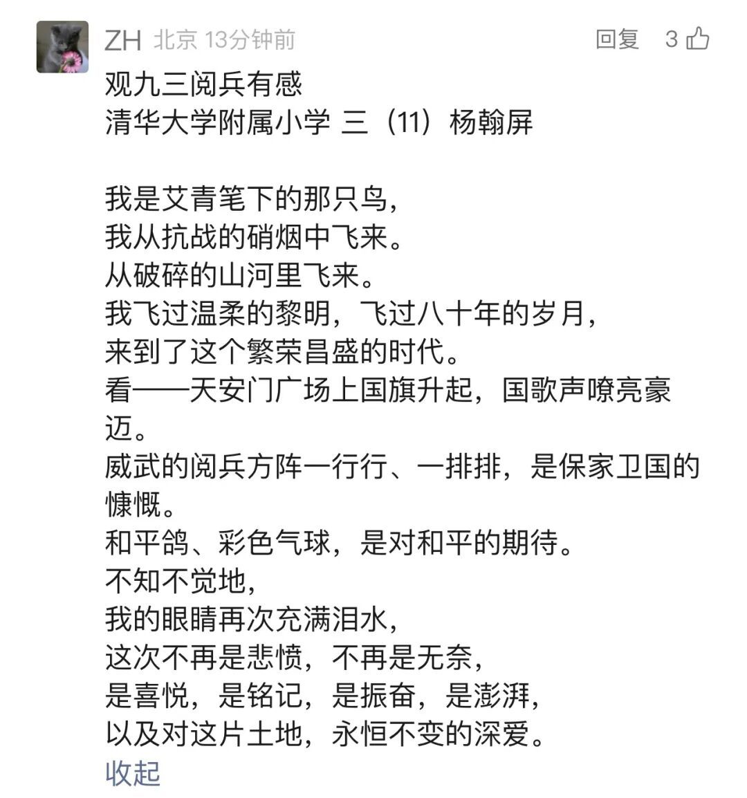 北京市清华大学附属小学的学生 杨翰屏:“我的眼睛再次充满泪水,这次不再是悲愤,不再是无奈,是喜悦,是铭记,是振奋,是澎湃,以及对这片土地,永恒不变的深爱。