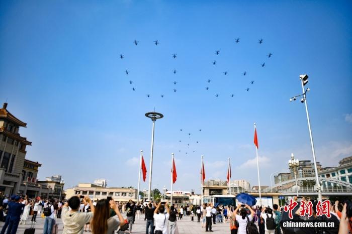 直升机组成巨大的“80”字样。中新社记者 杨华峰 摄
