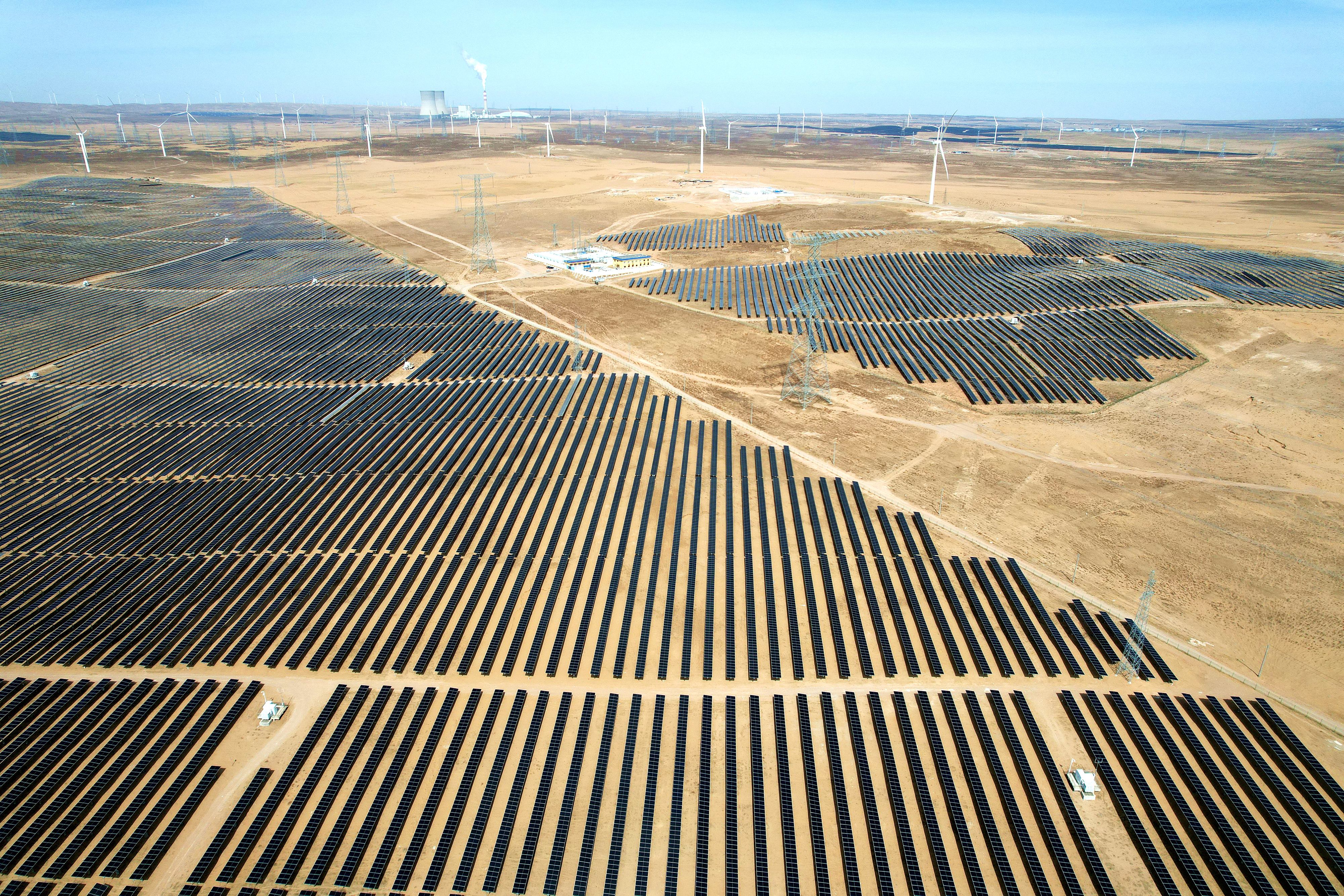 2026年3月18日,宁夏银川,在灵武市白土岗乡的一处光伏产业基地,成片的太阳能光伏板汇成一片“蓝色海洋”。